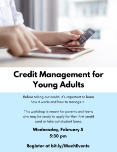 Join Mechanicville District Public Library (190 N Main St, Mechanicville, NY 12118) on February 5th at 5:30pm for Credit Management for Young Adults.